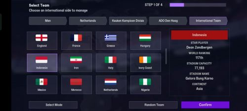 To manage Indonesia from the start, you must first manage a Netherlands club - Exclude first_names.dat and second_names.dat if loading database is slow